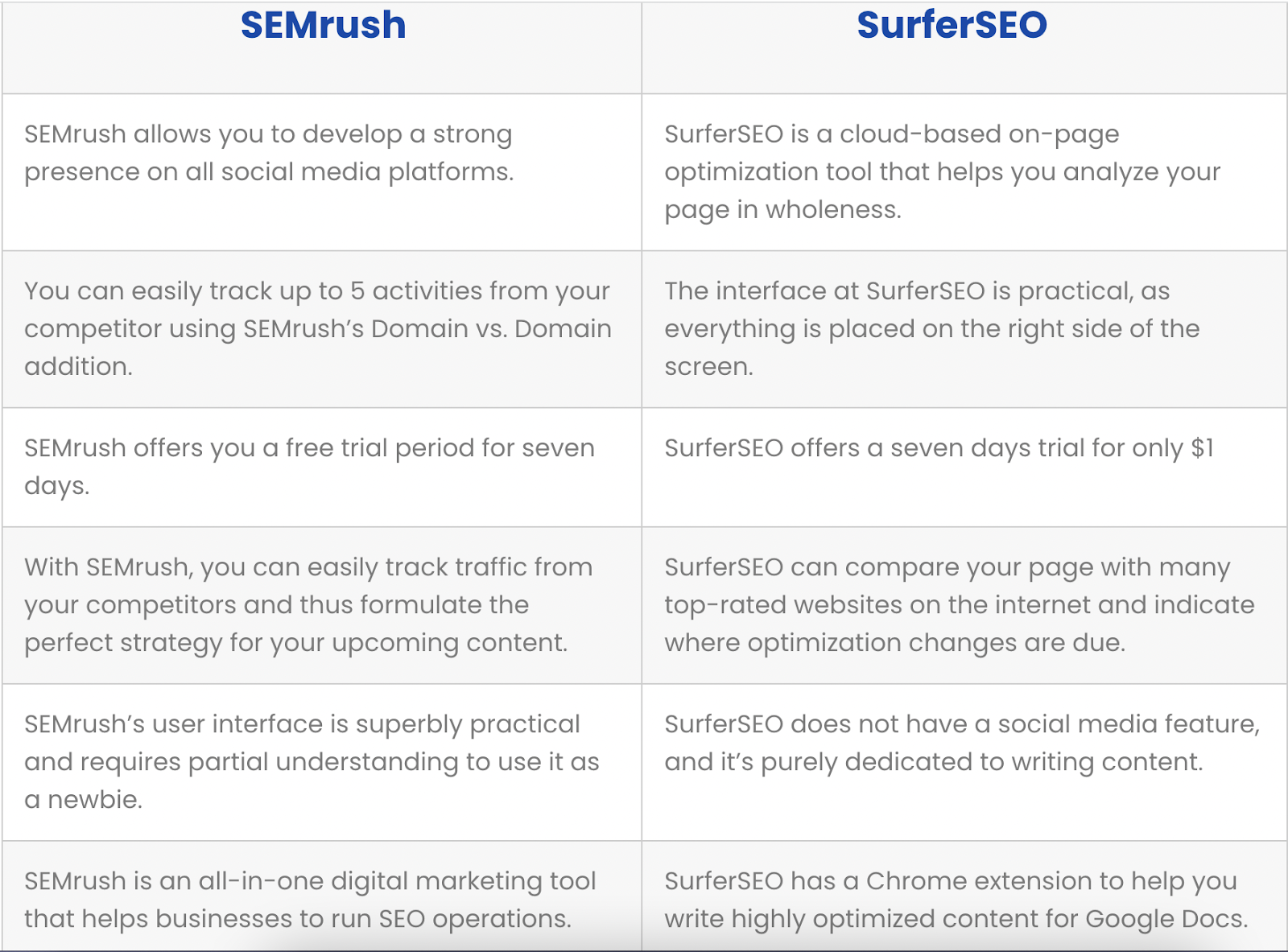 Both Surfer SEO and Semrush are online tools mainly for web page optimization to improve search engine rankings. While Surfer SEO is a cloud-based SEO tool, Semrush is an all-in-one onsite tool with several key features useful for digital marketing. To further help you understand the differences, the table below summarizes how Surfeo SEO and Semrush differ.